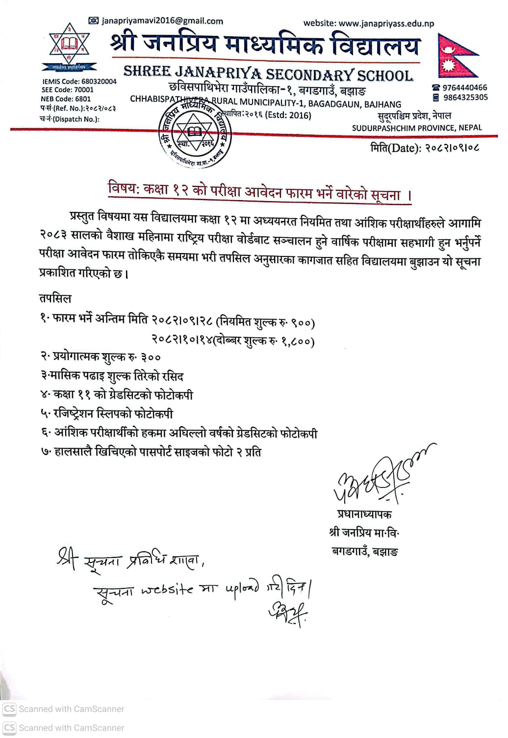कक्षा-12 को परीक्षा आवेदन फारम भर्ने वारेको सूचना