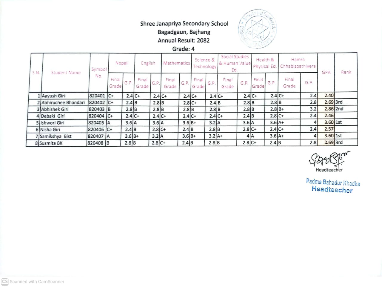 कक्षा ४ को ग्रेड रिजल्ट